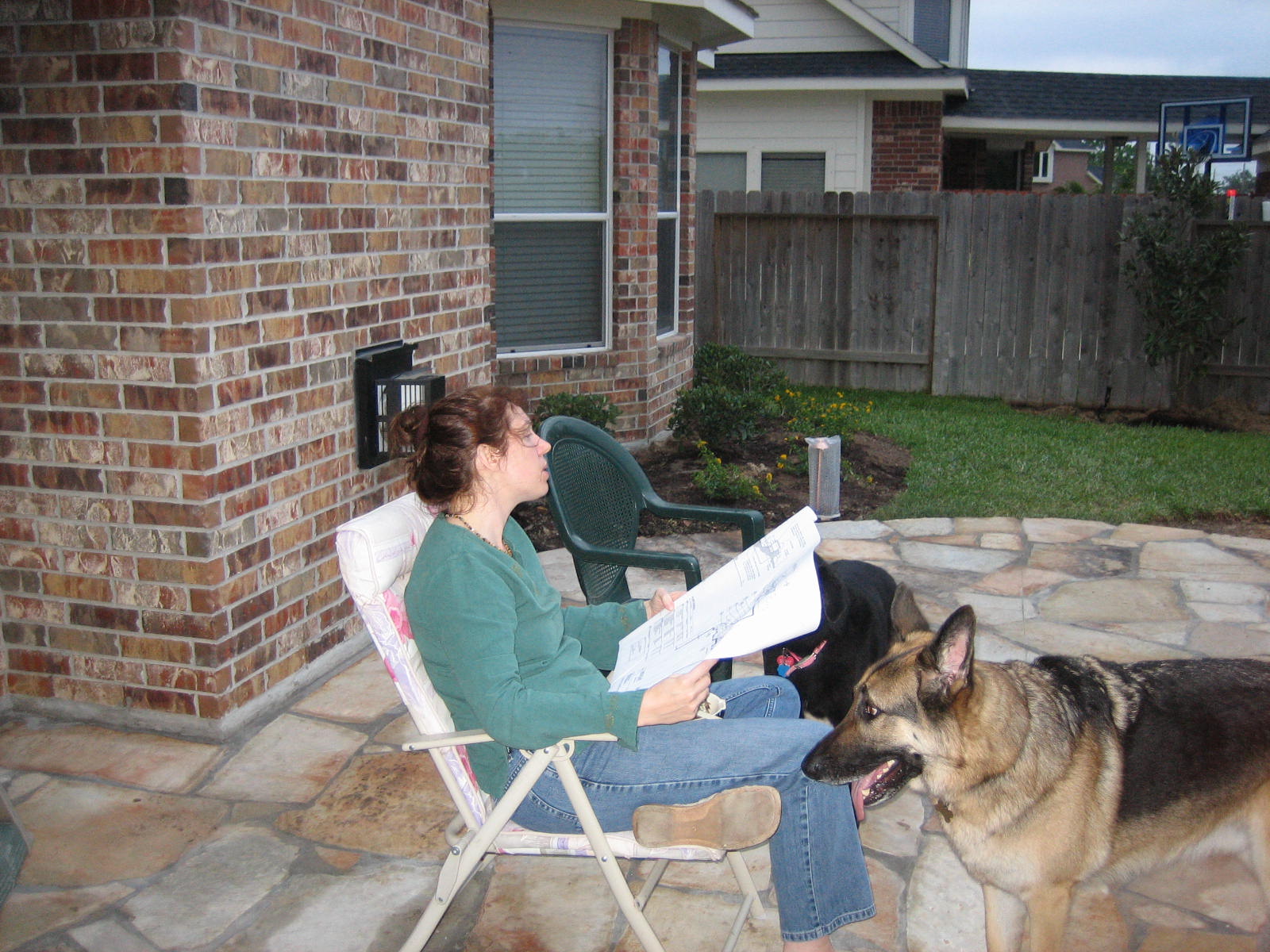 Jake helps with the design details of the new backyard. I am trying to figure out if things are going according to the blueprints.